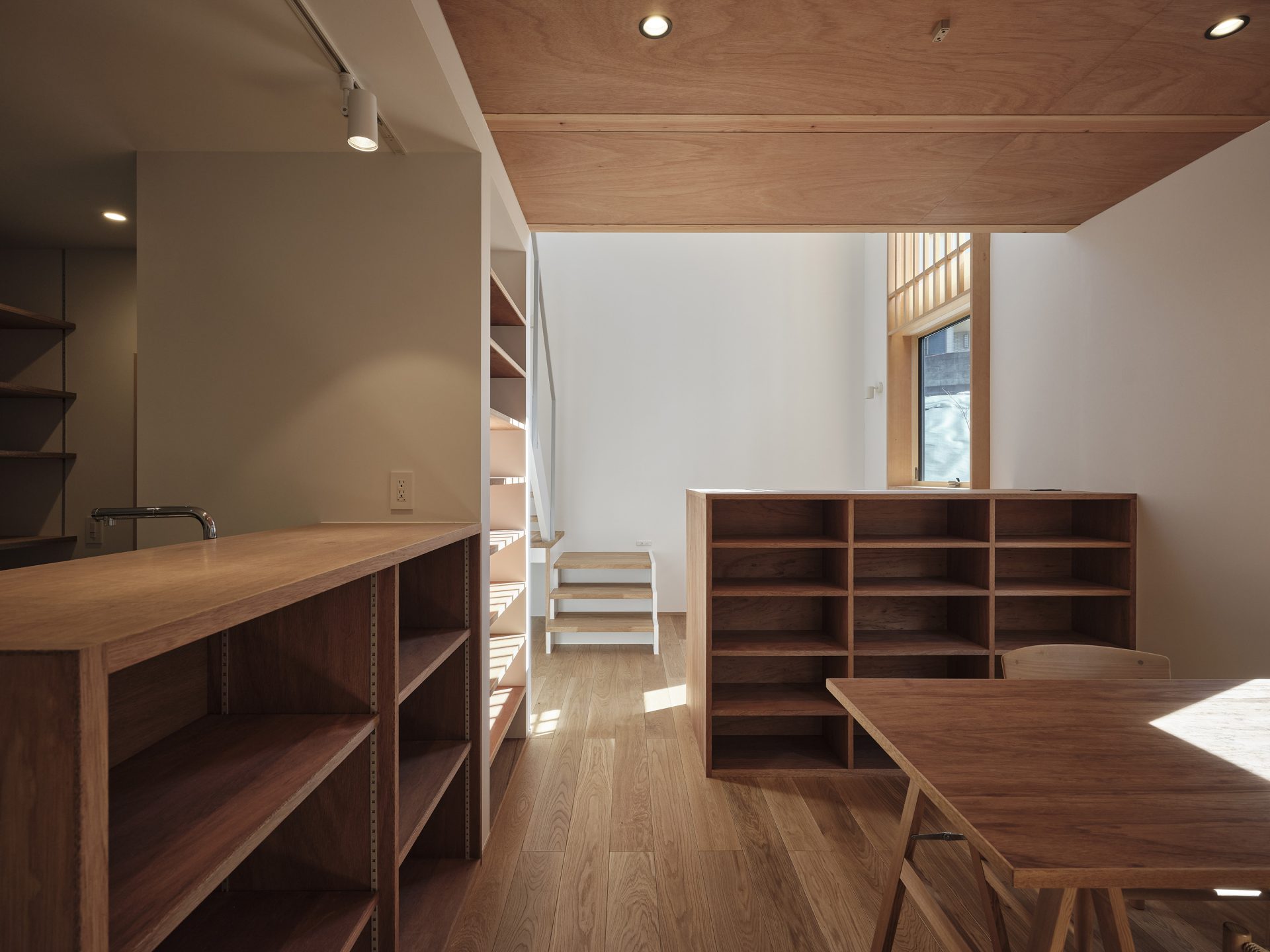 「町田の住宅」が建つのは、新しい造成地の端の土地。道路よりも2.4mほど高い場所に位置しています。設計を始めた時点では、造成されたばかりだったため、周りにどのような家が建つのか分かりませんでした。これから周りに建つ家を想像しながら、光りが差し込み、遠くに視線が抜けるように窓の位置や大きさに注意しながら設計をしました。設計を進める上で、空間をつくる大きな要素となる、具体的なクライアントからの要望が2つ。リビングに階段を設けることと、収納スペースを充実させたいということでした。この要望を受けて、リビングと階段の配置、リビングとダイニング、キッチンの関係を繰り返し考え、シューズクローク、ファミリークローゼット、家電収納、本棚などの収納スペースを必要な場所に必要な量を確保できるように設計を進めていきました。